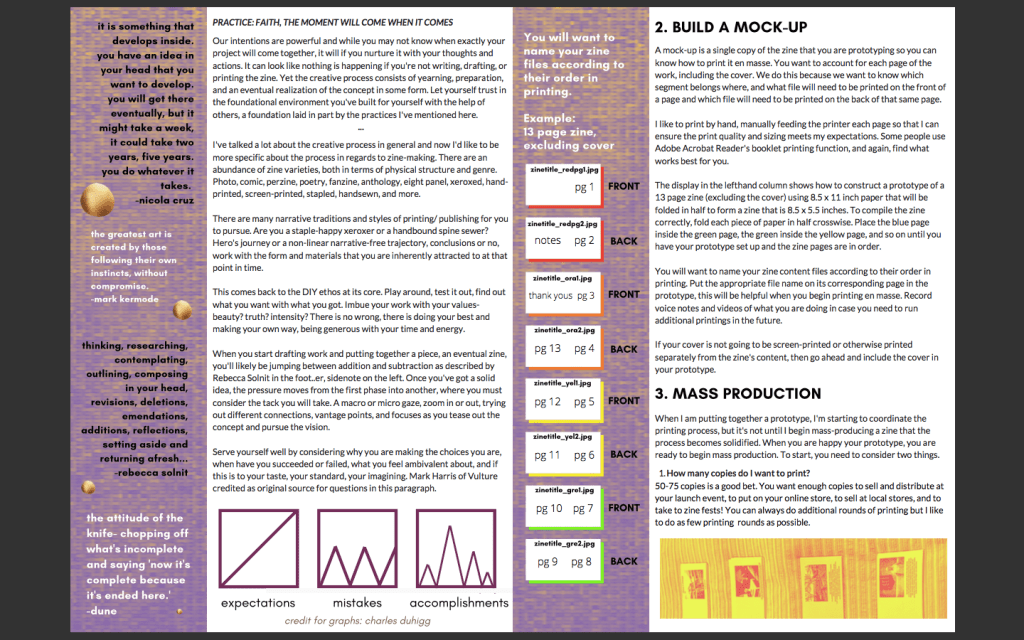 I hosted a workshop called “The Unfolding: Strategies for the Production and Release of a Zine” in May 2020 for Los Angeles Zine Fest. I divided this multi-step process into six phases, first step looks at how to generate zine content and identify a project’s values and purpose (such as lo-fi or hi-fi presentation possibilities, narrative structure varieties, and more). The second phase in the process is the creation of a fully fledged physical mock-up (printing by hand versus using Adobe InDesign) before moving to the third phase which is planning for mass production- how many zines should I print and what supplies do I need? After a zine has been printed en masse, a zine launch is in store! This means planning a zine launch and marketing the zine’s release in conjunction with a launch event. The last part of the process involves identifying where the zine can be shared/carried and what the long-term prospects and needs of the zine are- should I run another printing? Should I approach a publisher about printing it under their imprint? Does the zine need a successor and/or alternate versions- digital or audio? This resource is accessible by any skill level, certain segments will be more accessible than others for beginners, but the concepts explored are good for all DIY publishers to consider.
