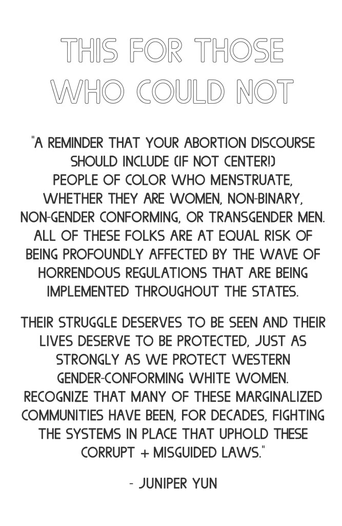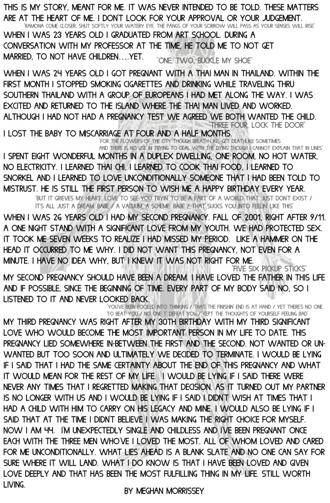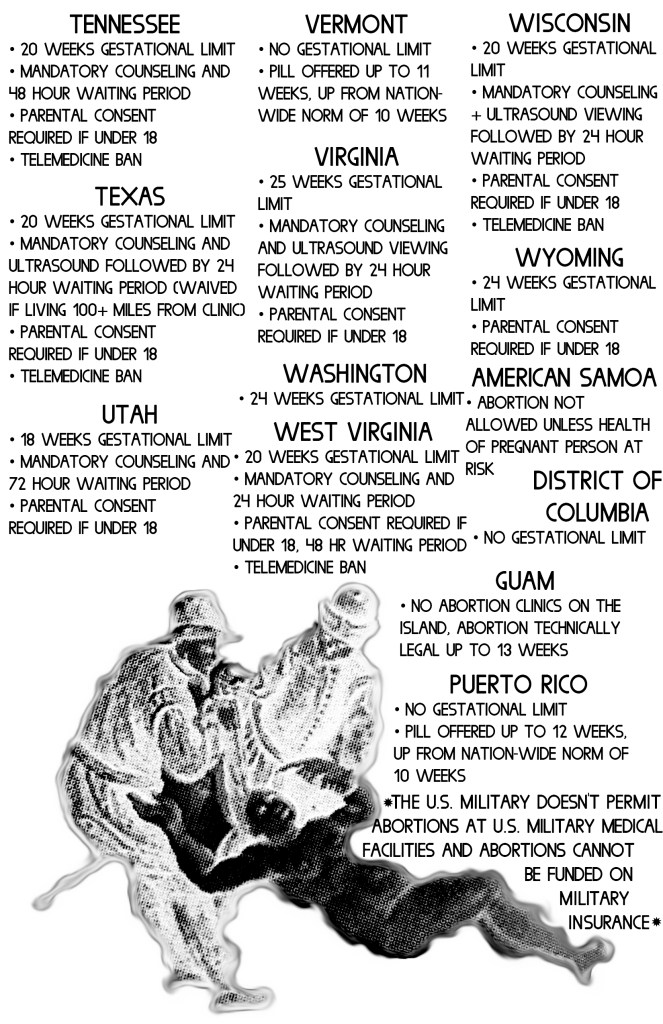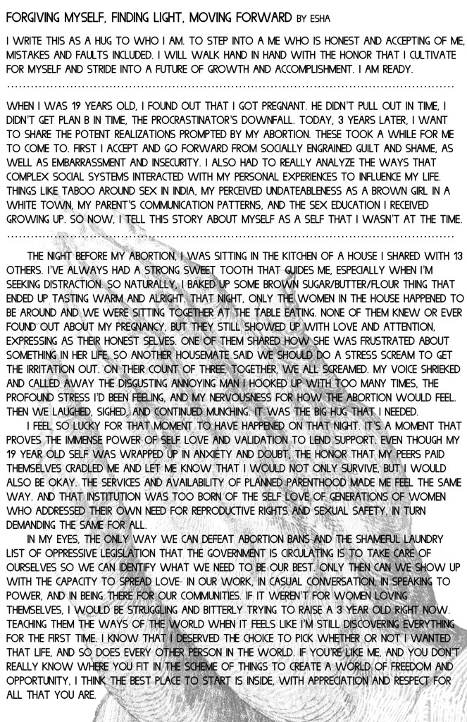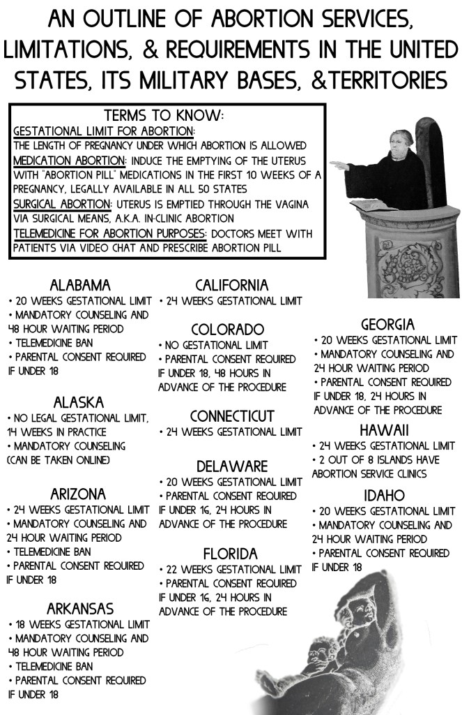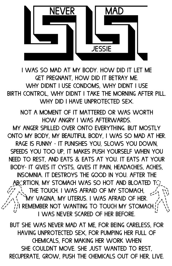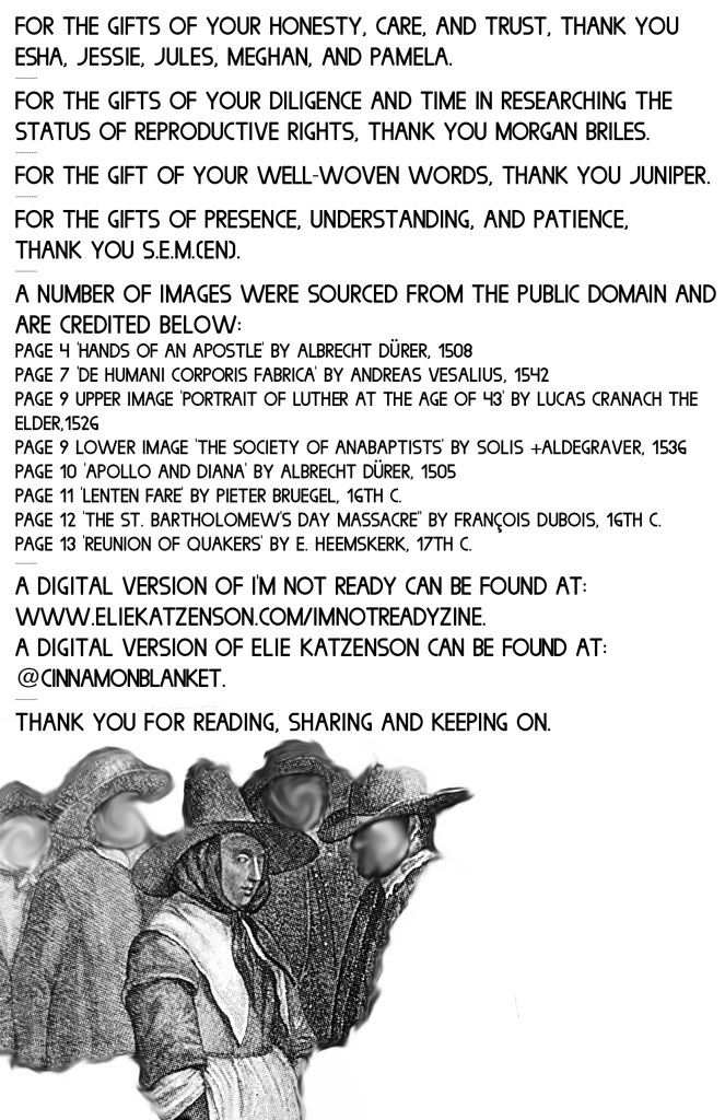 I’m Not Ready is an anthological zine examining the care, complications, and contradictions of having an abortion or elective miscarriage. Each cover was screenprinted, the first half of the zine contains six accounts of firsthand experiences from people with XX chromosomes who have had abortions. The second half contains a listing of reproductive rights and restrictions for all US states, territories, and military bases with accompanying art from the Reformation era. July 2019. This work was made possible in part by a grant from the Ara Jo Memorial Fund and was accepted for publication and distribution by Microcosm Publishing starting September 2019.