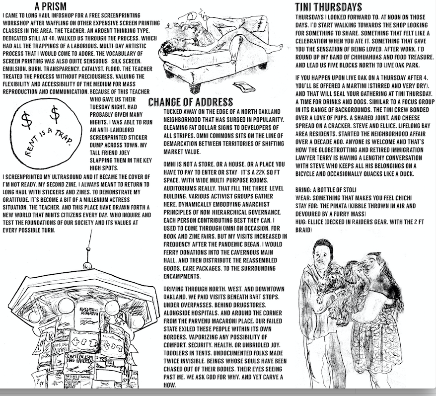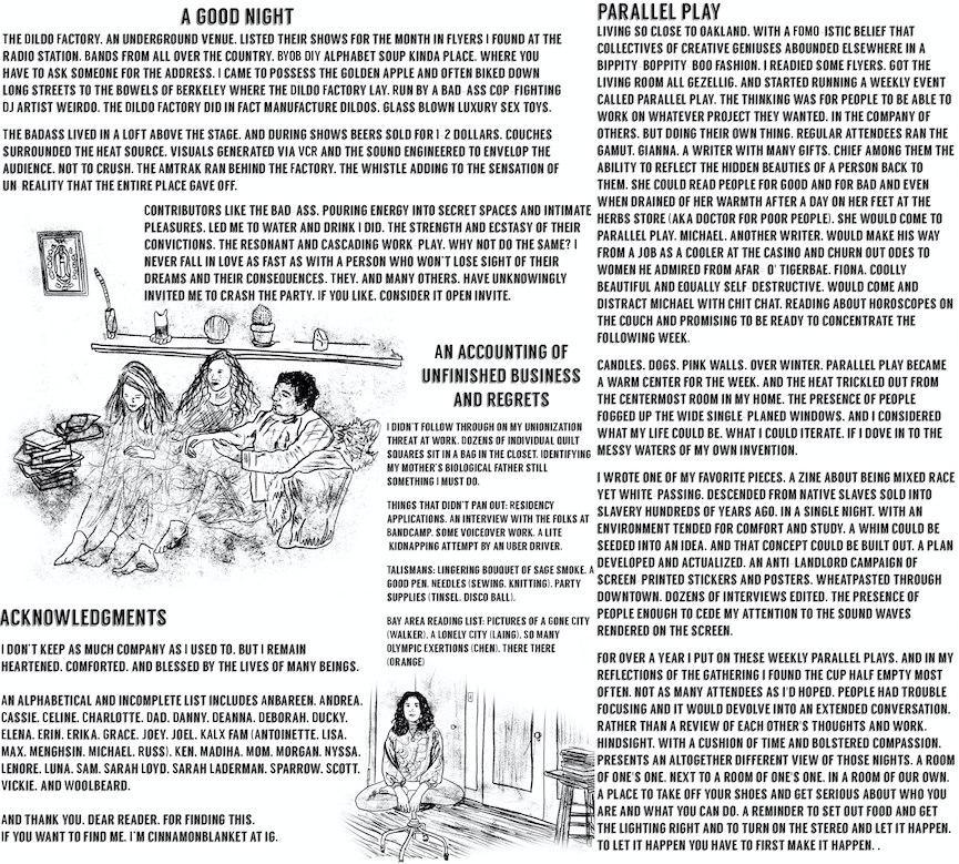 1830 Walnut is a memoir-travelogue that exalts and shit talks the East Bay, holding seven yrs of scenes, places, and memories frequented. Writings and drawings in an accordion book format. A few copies available at Pegasus Books in downtown Berkeley, otherwise DM me for yours. Command+ is your friend when reading some of the smaller fonts below. Hunting for treasure!!